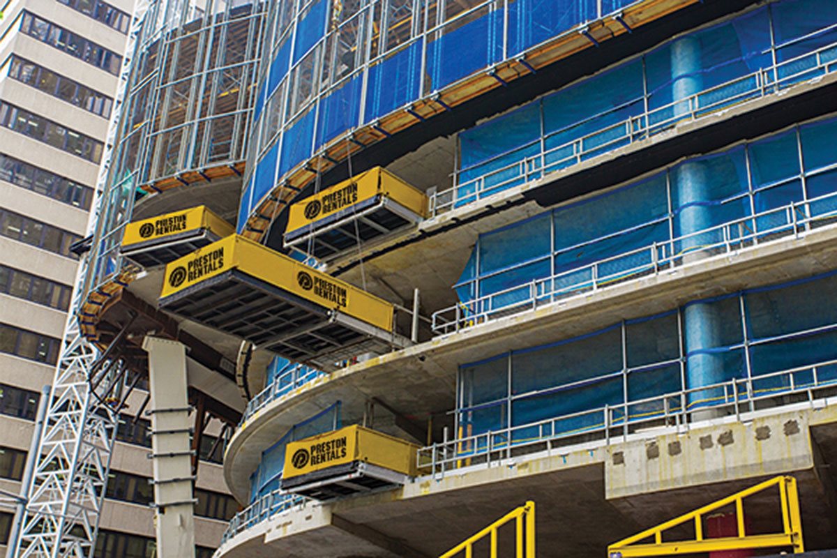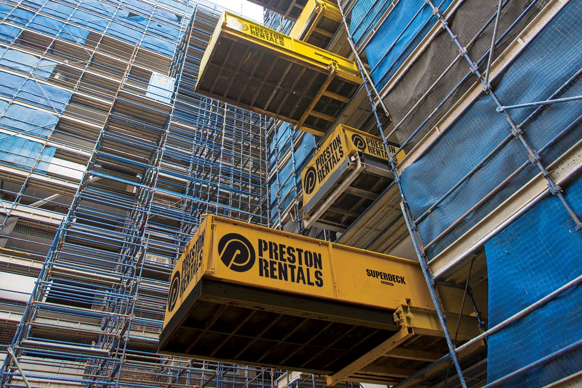 The Superdeck® is a retractable loading platform system ideally positioned vertically, one above the other, for fast delivery of building materials directly to the designated floor of a multi-level building. The average 5 story building requires 3-4 Superdecks® while larger, 50 story buildings may need up to 30 Superdecks®.